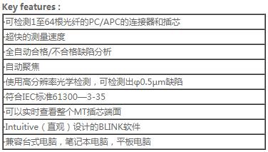 新款D-SCOPE MT是目前市场上测量MTP/MPO端面缺陷最快的设备。一次测量可以完成插芯上所有光纤端面缺陷的判断,同时操作者也可以查看插芯端面和插芯PIN孔的洁净度。全自动DSCOPE MT是检测光纤连接器端面缺陷标准与IEC标准一致,它是让检测插芯端面达到IEC标准最理想的仪器。DSCOPE MT 具有非常高的测量精度,它被设计适用于大批量制造或最要求最苛刻的实验室。