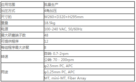 运用触摸到屏可实现便捷的操作,且可输入多种连接器的研磨工程程序;除具有慢速启动功能外,还可对各个工序的运转台面速度启动功能外,还可对各个工序的运转台面速度进行调整;采用通用电源,在世界各地不用变压器即可使用;继承了SFP-550S2的研磨时间自动调整功能,从而提高研磨形状的一致性和研磨片的使用寿命。